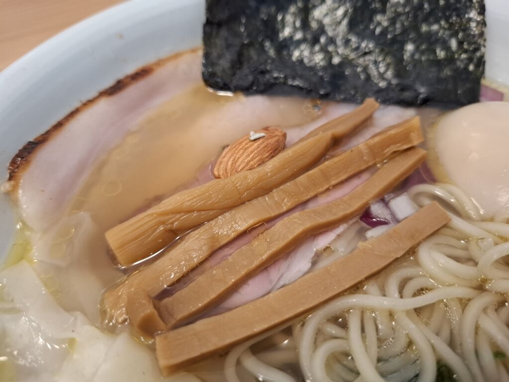 メンマ、肉雲呑、味玉は相変わらず旨いし、気になるアーモンド?も、口の中で砕いてからスープをゴクリ。