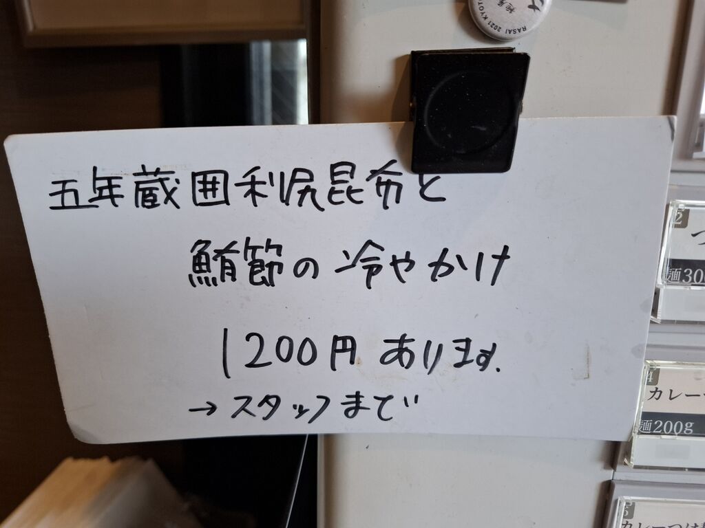 『五年蔵囲利尻昆布と鮪節の冷やかけ 1200円』を、注文し中待ち一番へ。