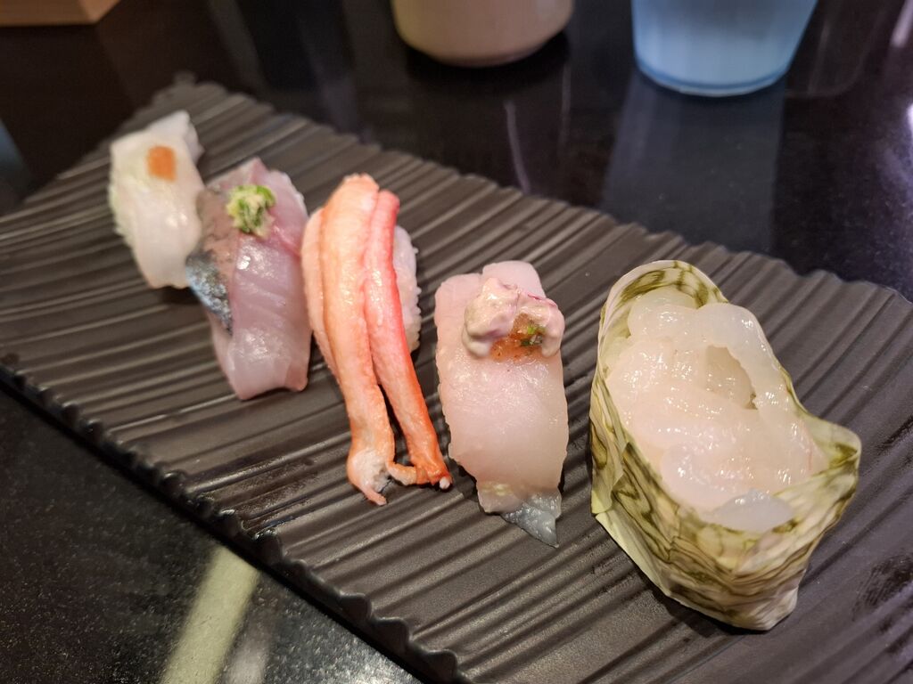 🍣地物五種盛り(白エビ・紅ずわいがに・あじ・平目・皮はぎ)