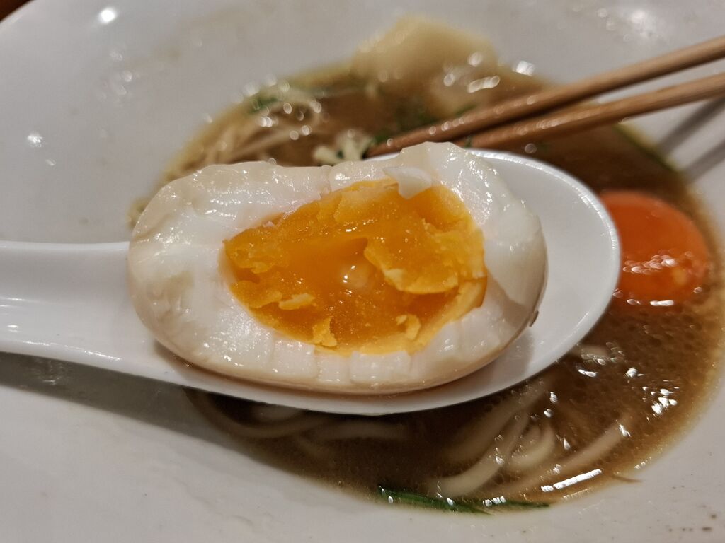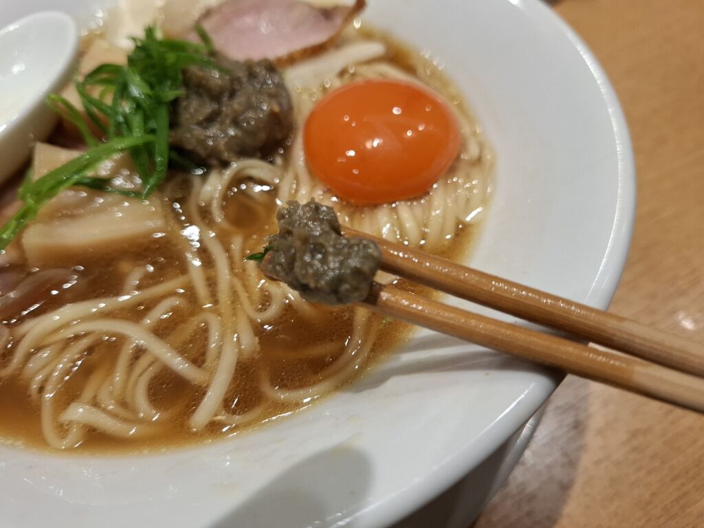 そして使い方分からなかった卵黄は最後に麺に絡めますが、蟹味噌でコクが増したスープを絡めた麺に濃厚な黄身が絡んでこれまた美味し😀ウマスギ