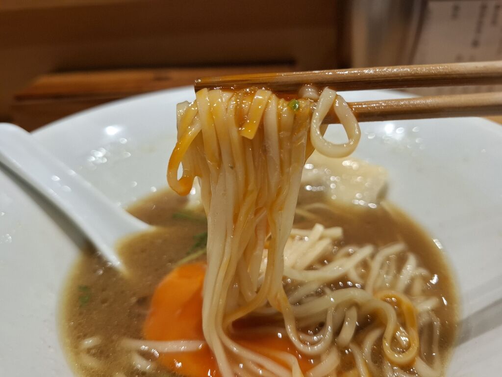 麺は細め平打ちのしなやかな感じで、ズルズルっとすすると美味い味噌スープが口の中に飛び込みメチャクチャいい感じ🥰
