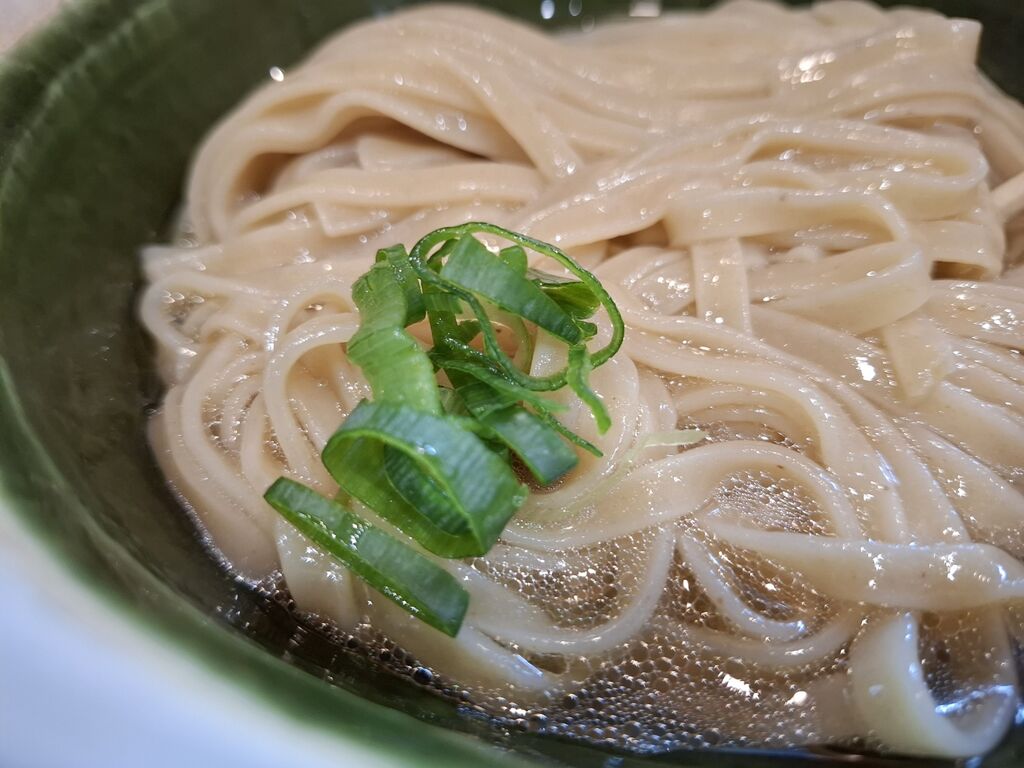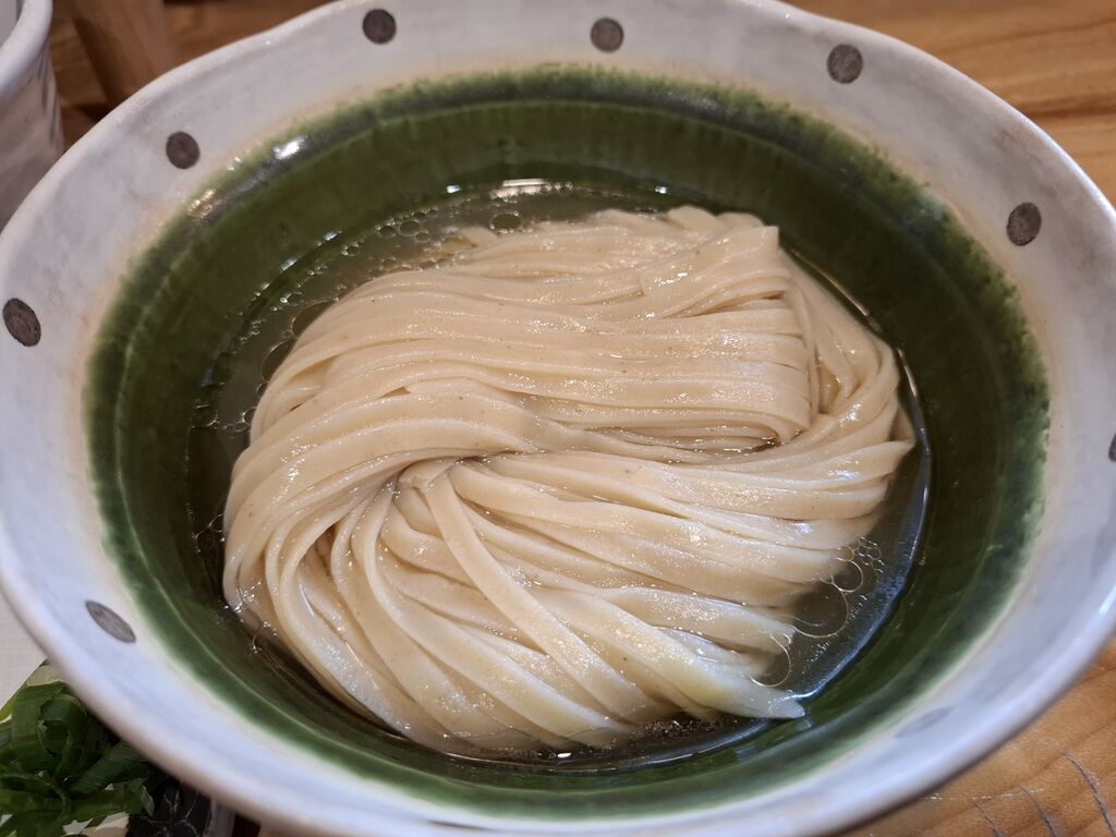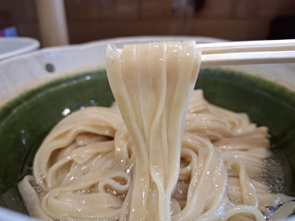 キレイな平打ち麺は粒かうっすら入っております。