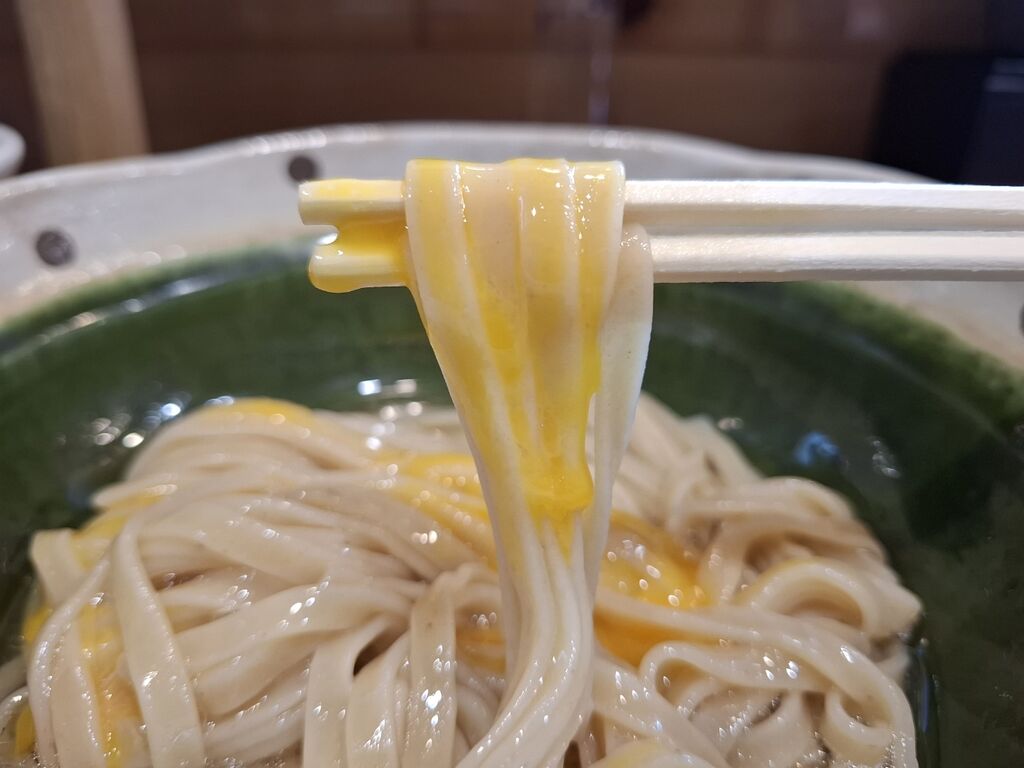 「玉子が多いので。。。量を気をつけて」の注意喚起が聞こえてくるものの、玉子の食べ方の正解がわからないので、多いなら💡と、レンゲで卵黄だけすくいだし、卵黄のみ麺と絡めます🐔