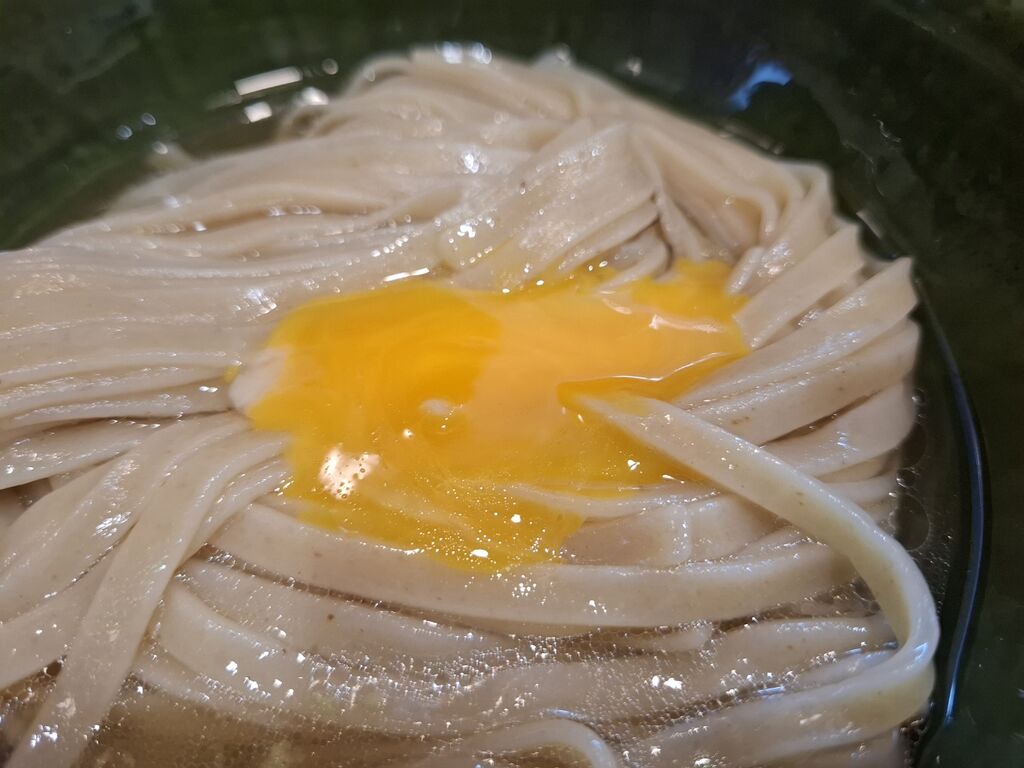 そして葱を絡めて麺をすする、ワサビを絡めて麺をすすると一通り食べて、いよいよ玉子🤔