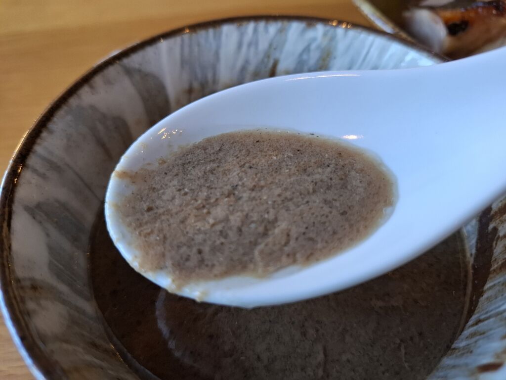 まずは「飲む秋刀魚」と言われるつけ汁をレンゲでゴクリ。