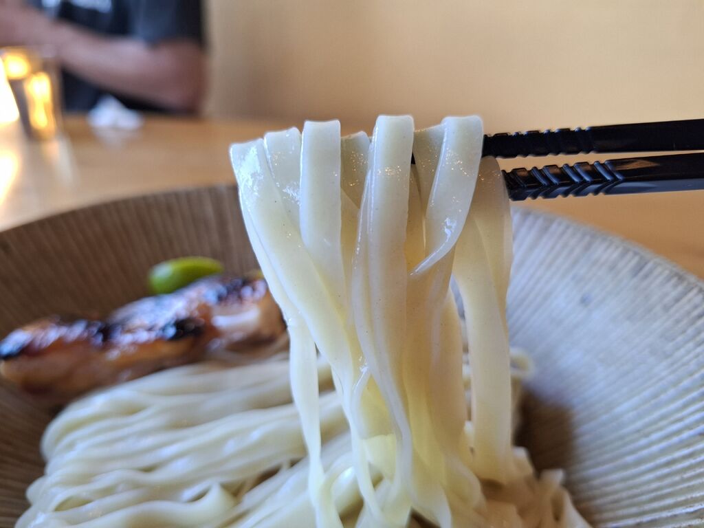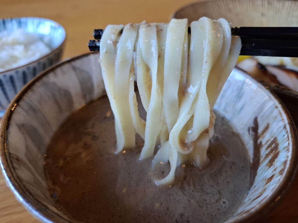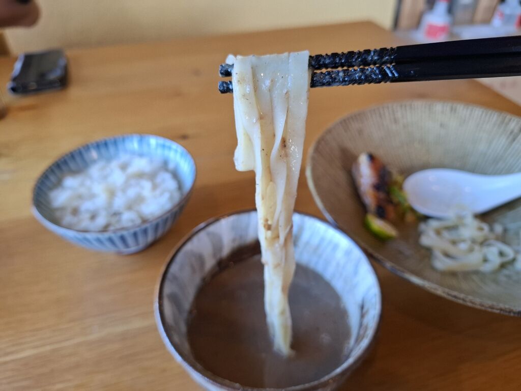 平打ちで長さががかなり長く、見た目よりしっかりと弾力あるけどプチンときれる麺はくっつき易すそうな肌感で、何かお出汁がかけられてますね🤔ナンダ?