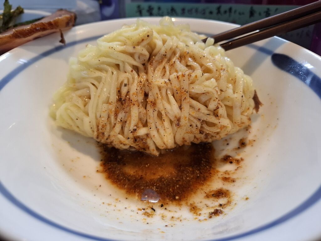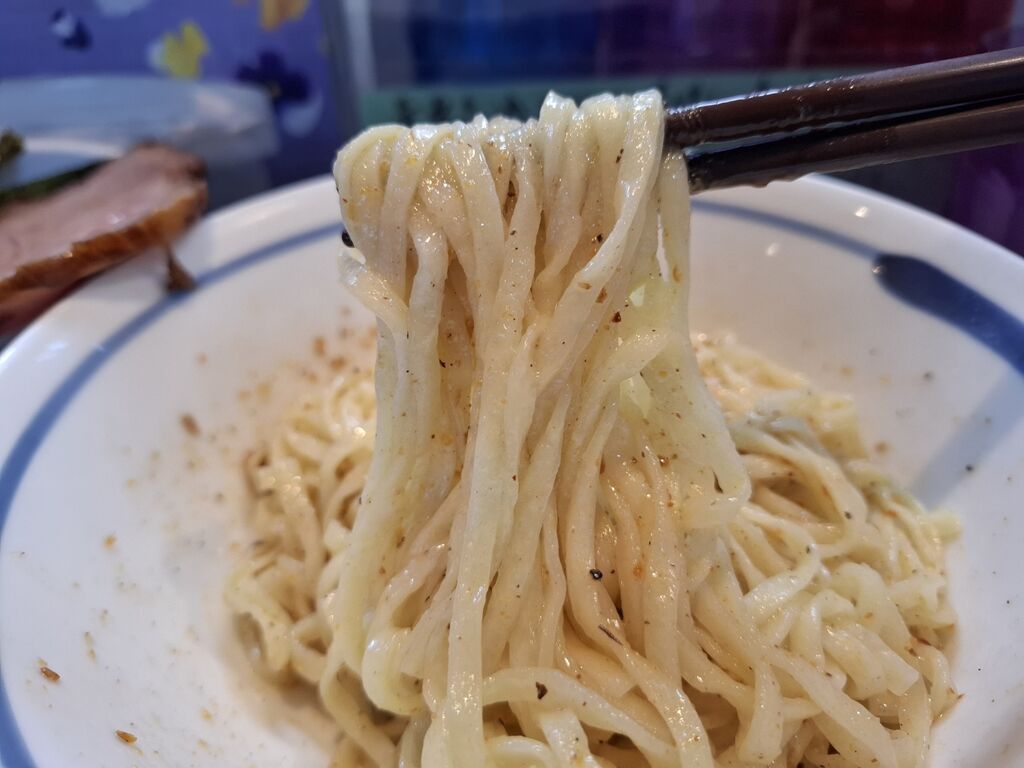 グリグリと天地ひっくり返し混ぜ混ぜ🌀して魚粉が全体にいき届いたら、麺リフトしてズルズルっとすすります。