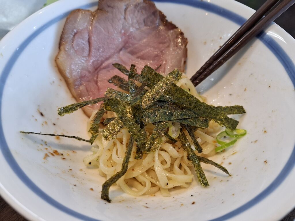 本日も特製トッピングなのですが、2杯目を考慮して中盤にネギをメインに混ぜて食べますがこの麺と葱もふわもち麺にシャキッと刺激あるネギで旨いし、後半の海苔コンボは先週同様に相性良すぎ!!