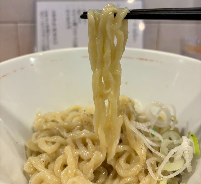 まずはオンリー麺を頂きますがニュルもちぺったん平打ち太ちぢれのピロピロ麺は食べてて食感がめちゃくちゃ楽しいです🤭