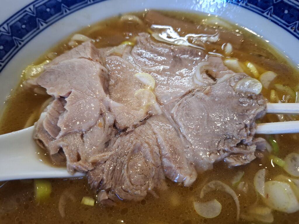 ステーキのような厚みで乗せられたチャーシューは店主が触っても崩れませんが、箸で持ち上げるとホロホロとなる😮ホエ