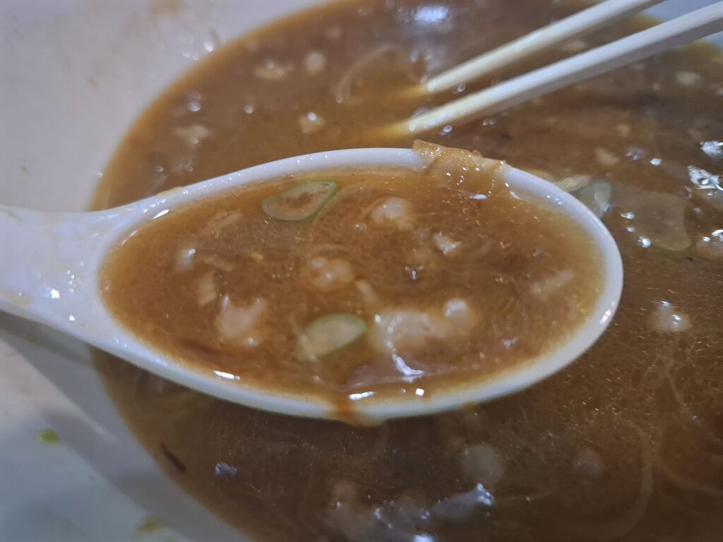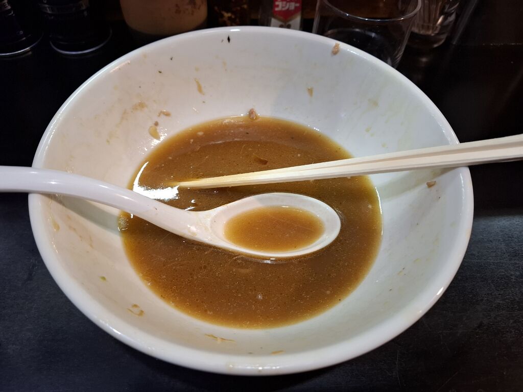 中盤くらいから、スープの内容物が混ざりだし、この節ガツン背脂プカプカ焦がし葱!なスープが完全に口に馴染んできたのか、多かった麺もペロリと無くなりました。
