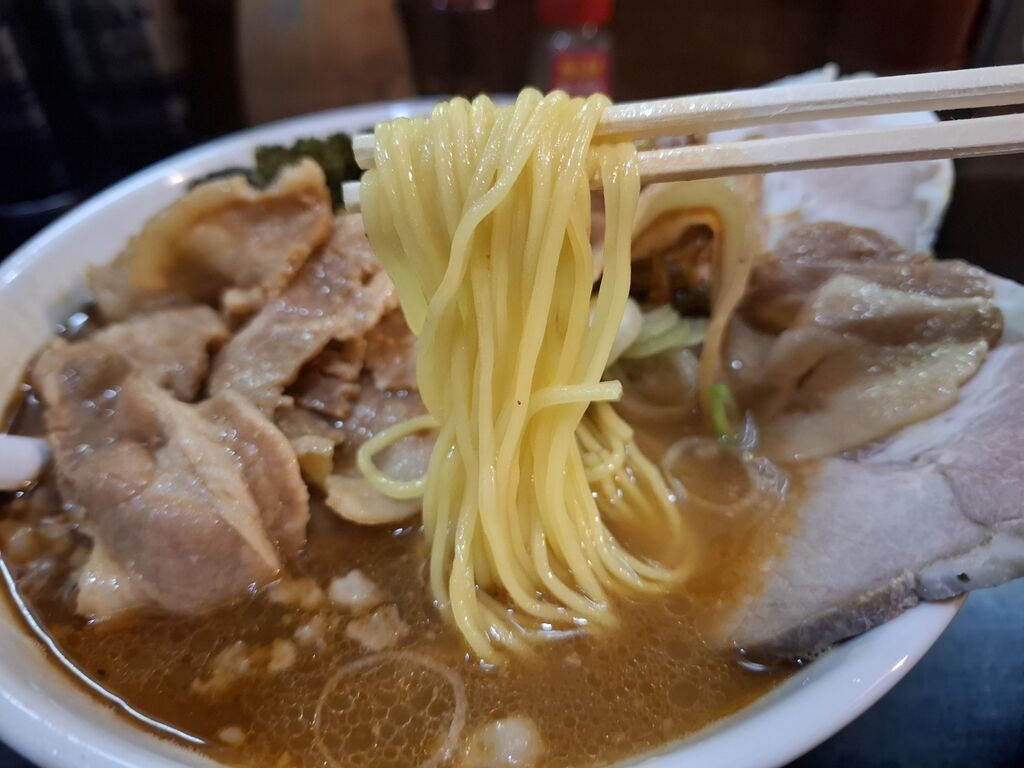 この意外な黄色い麺は、いい意味でスープのパンチに負けない存在感ありましたね🙂