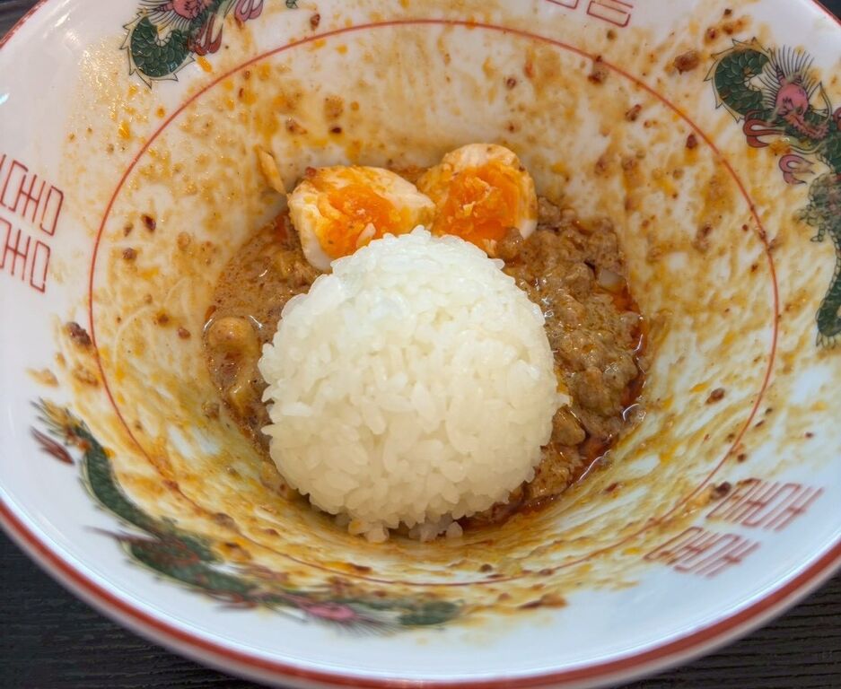 そして一つ残しておいた味玉と残った具材とタレに暖かいご飯をどぼんして頂きますが…