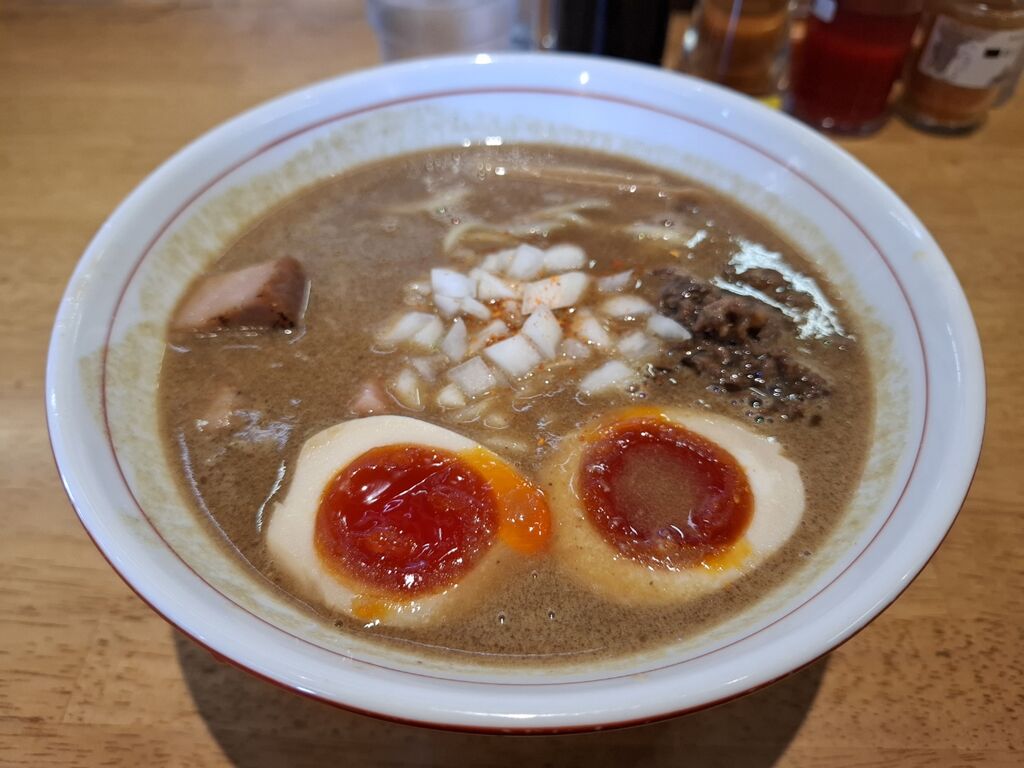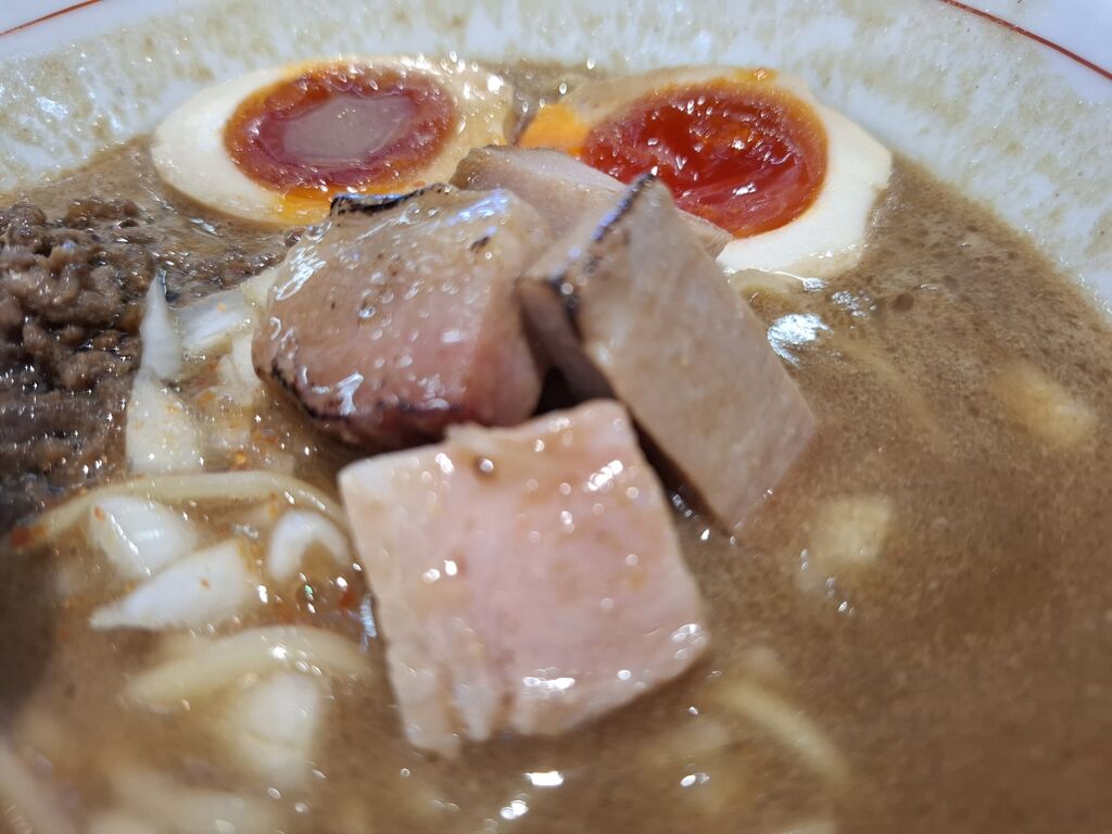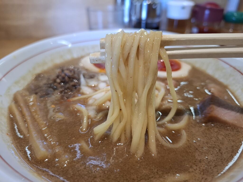 あと、角切りの生玉葱や甘辛い挽肉が入っているので、麺と一緒に食べると、肉の旨味や玉葱の刺激で味噌一辺倒でなく飽きずに啜り続けれます🍜