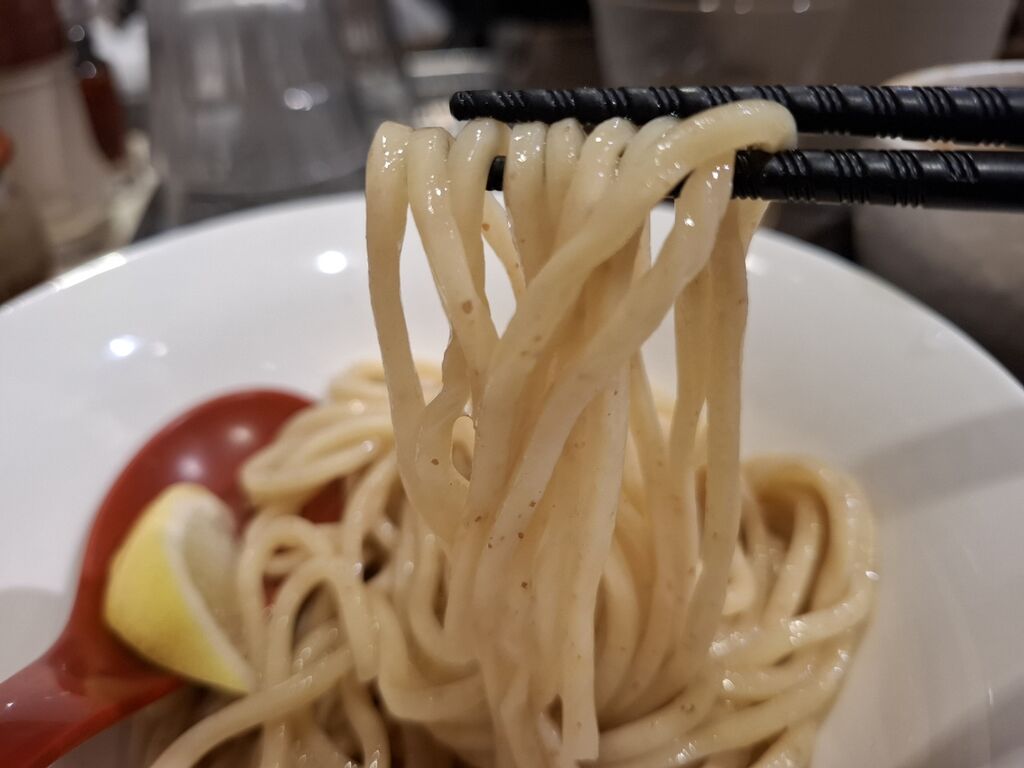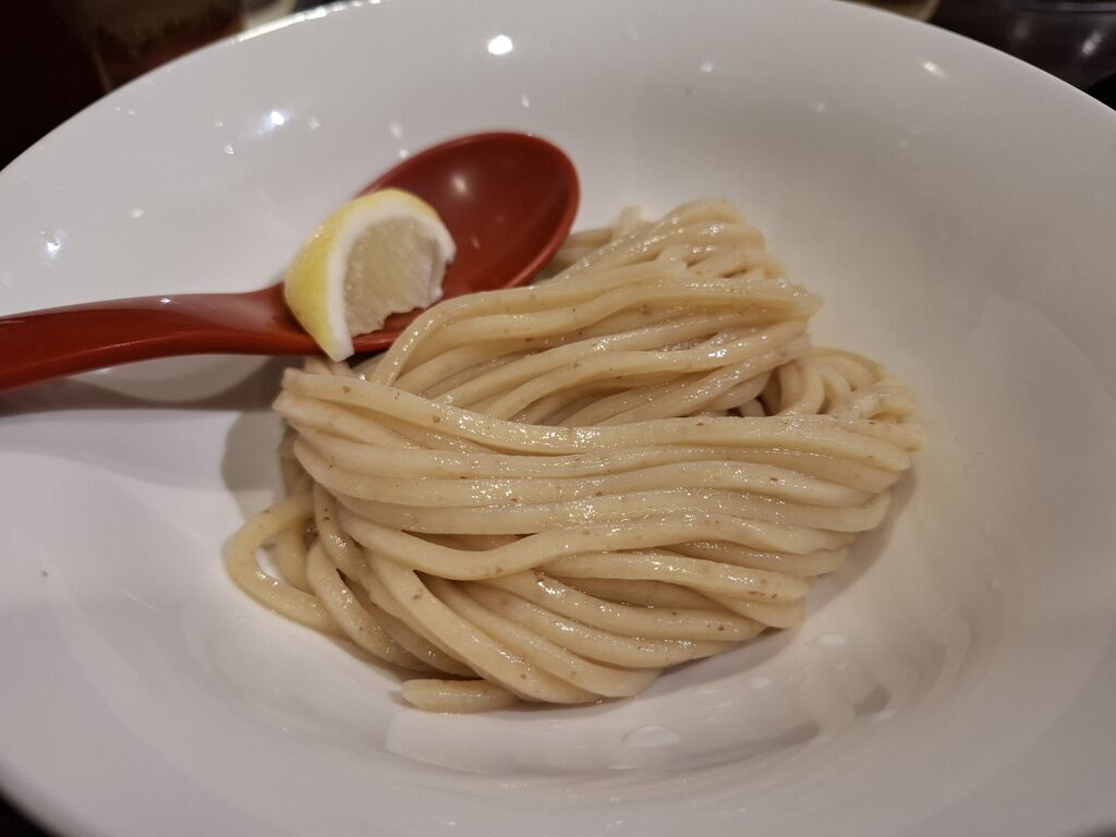 粒々入りの太麺はしっかりとしたコシとホンノリ酸味が有るのはレモン?🤔ナノカ?