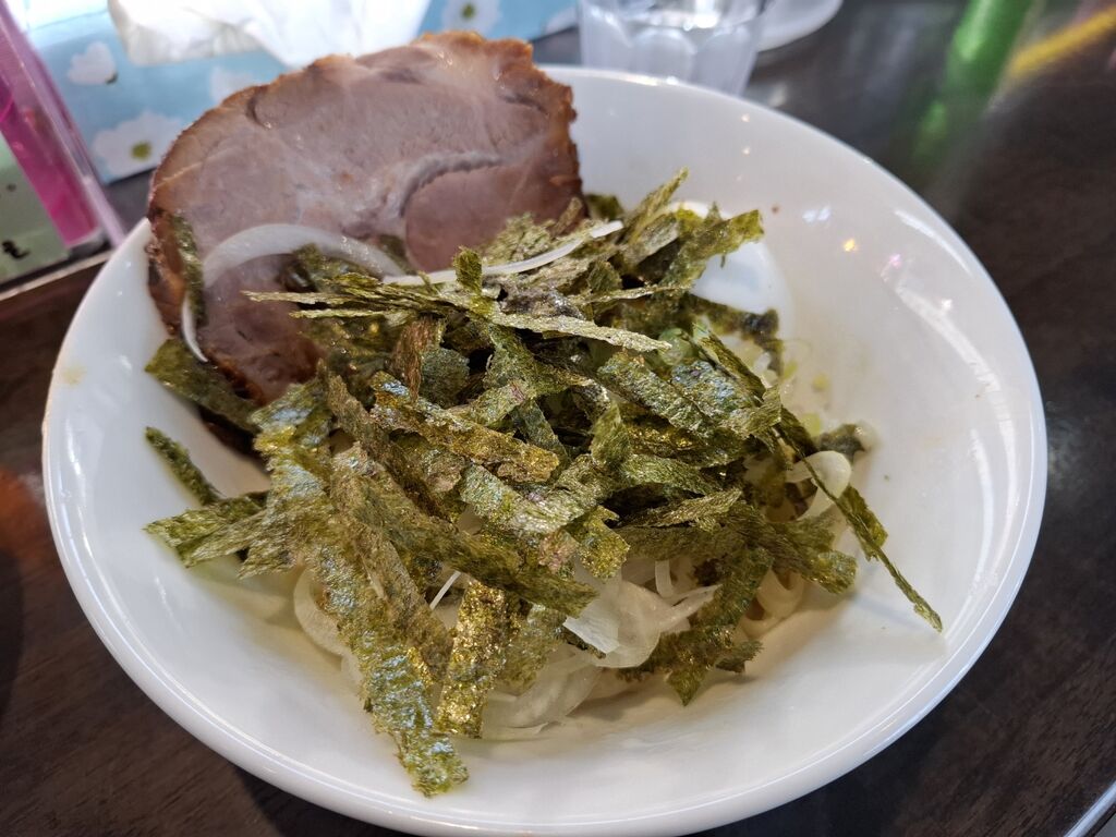 塩まぜそばと『塩』が品名にありますが、貝の旨味を突き抜くような塩味で、眠気が一気に吹き飛ぶような旨さです😛