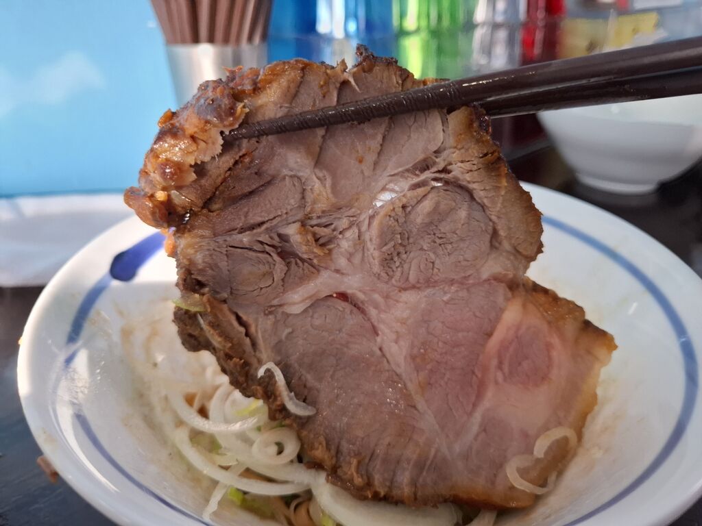 ステーキチャーシューをモリモリいただきますが、これだけで1日のパワー着きそうです。